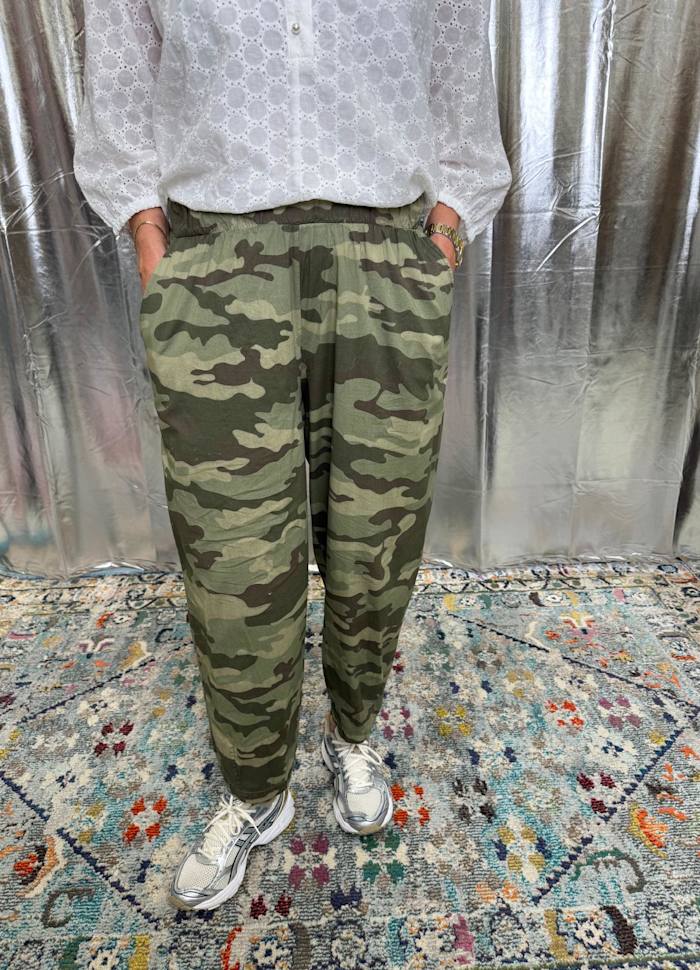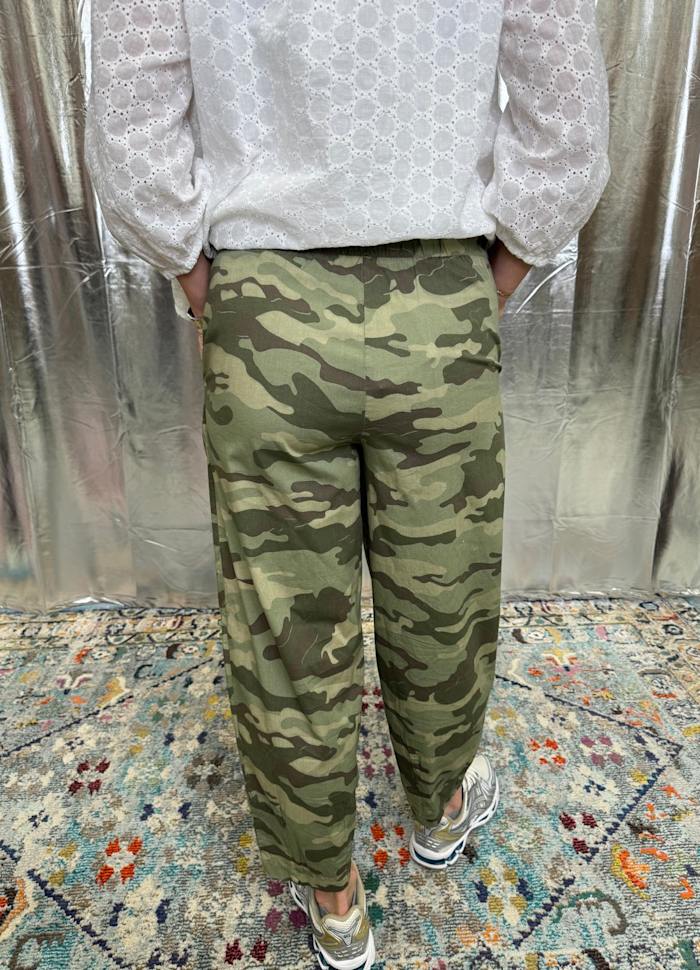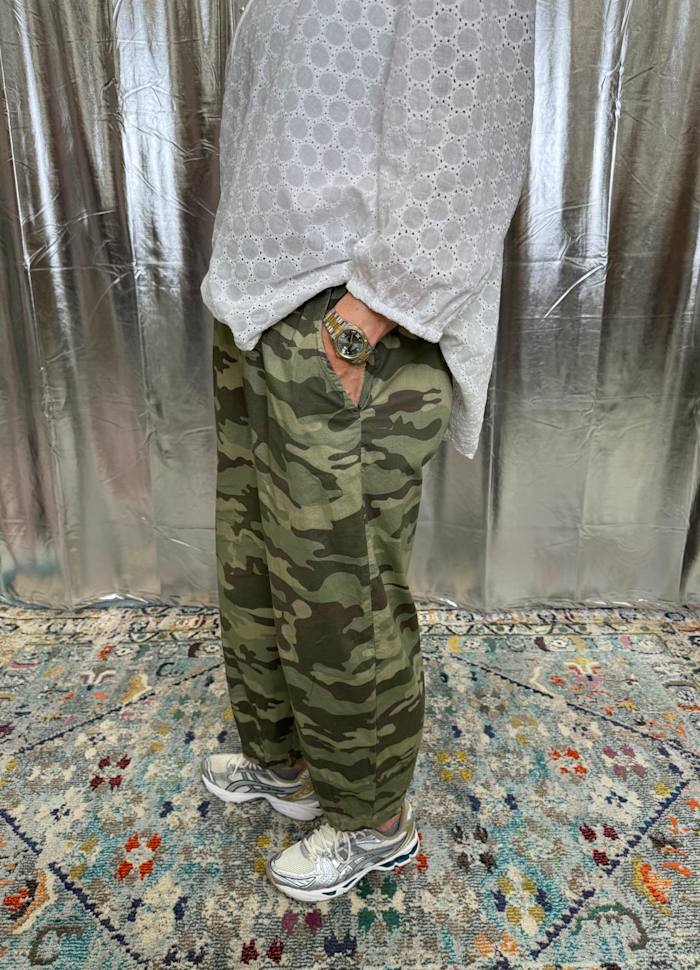 - Barrel leg trouser in green camouflage print.